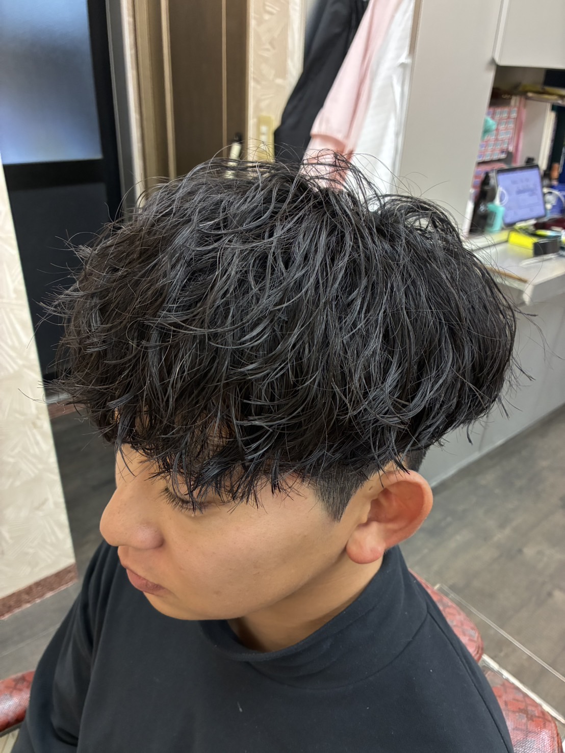 ヘアスタイルは、サイドからネープをツーブロックにしてトップはパーマをかけるので長さをある程度残したミディアムショートにカットしました。