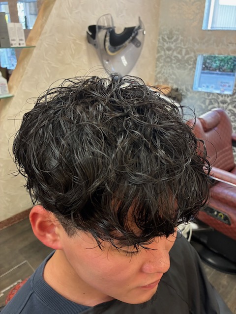 ヘアスタイルはサイドをツーブロックにしてネープは刈り上げ、トップはパーマをかけるのである程度長さを残したミディアムショートスタイルにカットしました。