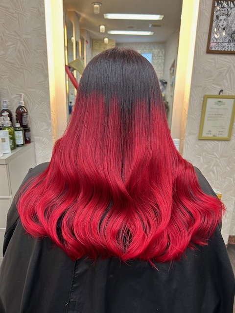 オンカラーはビビットな赤系のカラーを中間から毛先に入れて、トップはミルボン アディクシーカラーのボルドールビーを使いました。