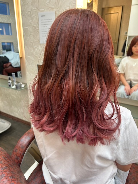 オンカラーには、根本から中間を赤系のカラーを使い、ブリーチした部分にはピンクを使いました。