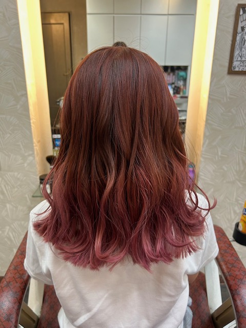 オンカラーには、根本から中間を赤系のカラーを使い、ブリーチした部分にはピンクを使いました。