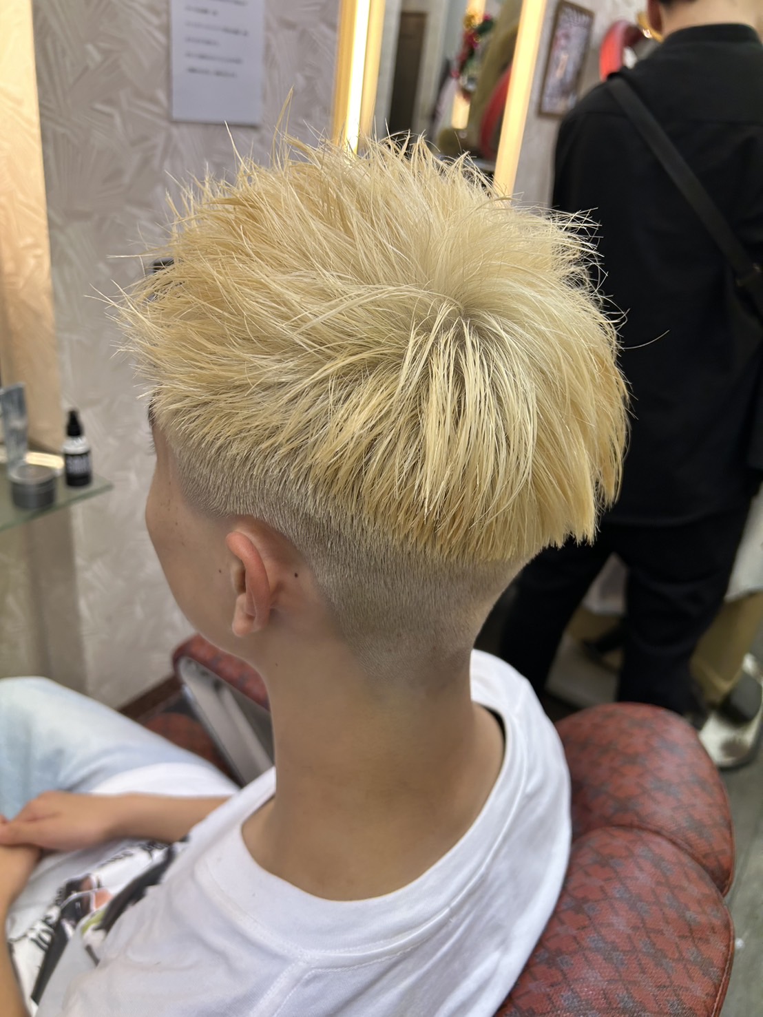 ヘアスタイルは、サイドからネープをフェード気味にツーブロックにしてトップはベリーショートにカットしました。